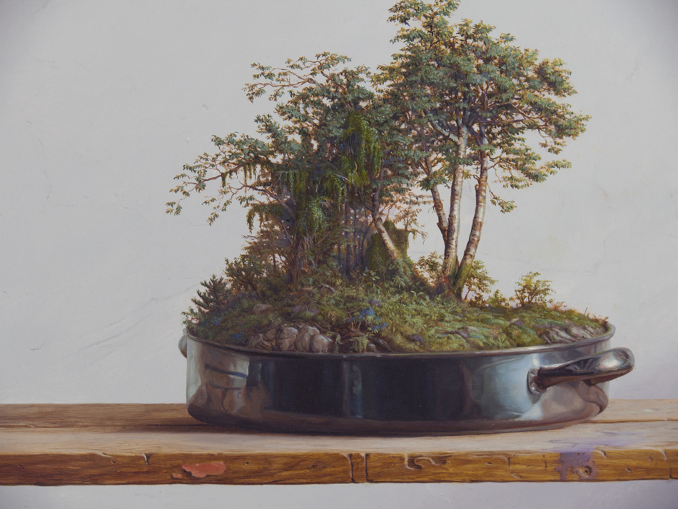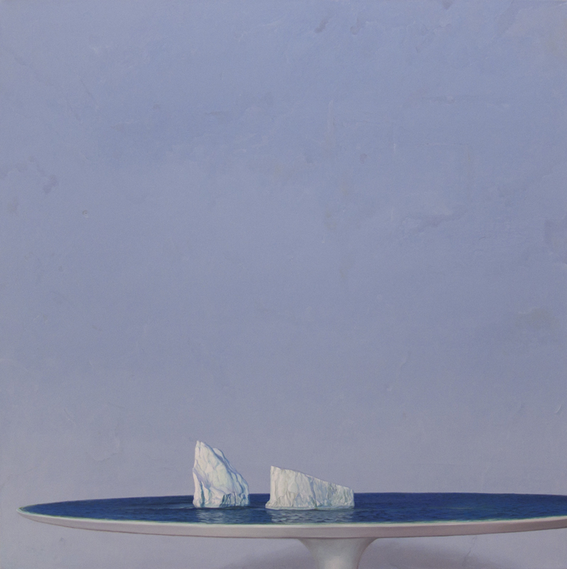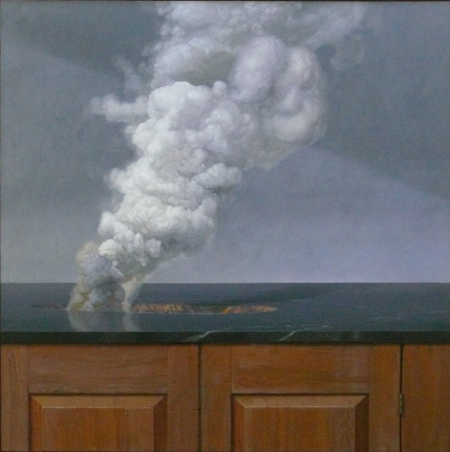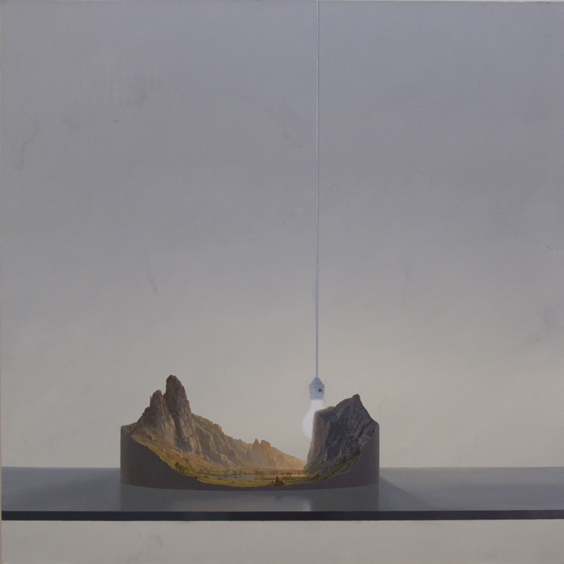 This group combines traditional still life painting and landscape. The landscape images are sometimes borrowed directly from 19th Century paintings by artists such as Frederic Church and Albert Bierstadt. These are incorporated into a small domestic space. The starting point was the thought that while we still place great value on the original paintings, they represent a view of the world that is anachronistic. For the Hudson River School generation the wilderness was certainly a place to visit, but the work of human civilization was always under threat from chaotic natural forces that would undo all of the hard work of building a habitable environment. Our conception of largely undisturbed tracts of land is that they represent a fragile order that is under threat from excessive human encroachment. We have become the chaotic force, and those endless landscapes appear very finite to us. Other themes include the commodification of landscape and our ability to ignore context when looking at something.