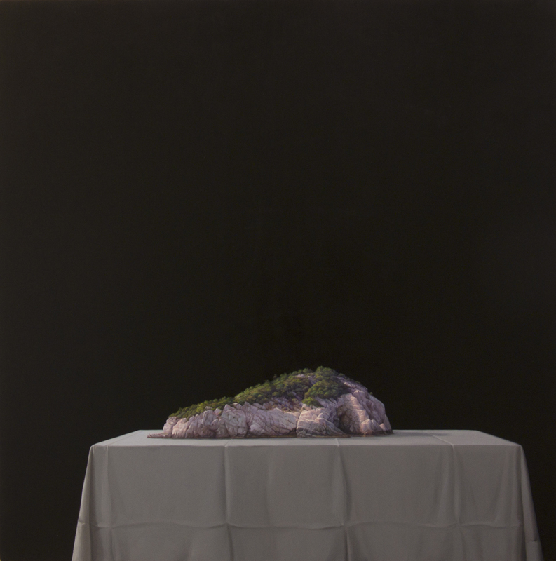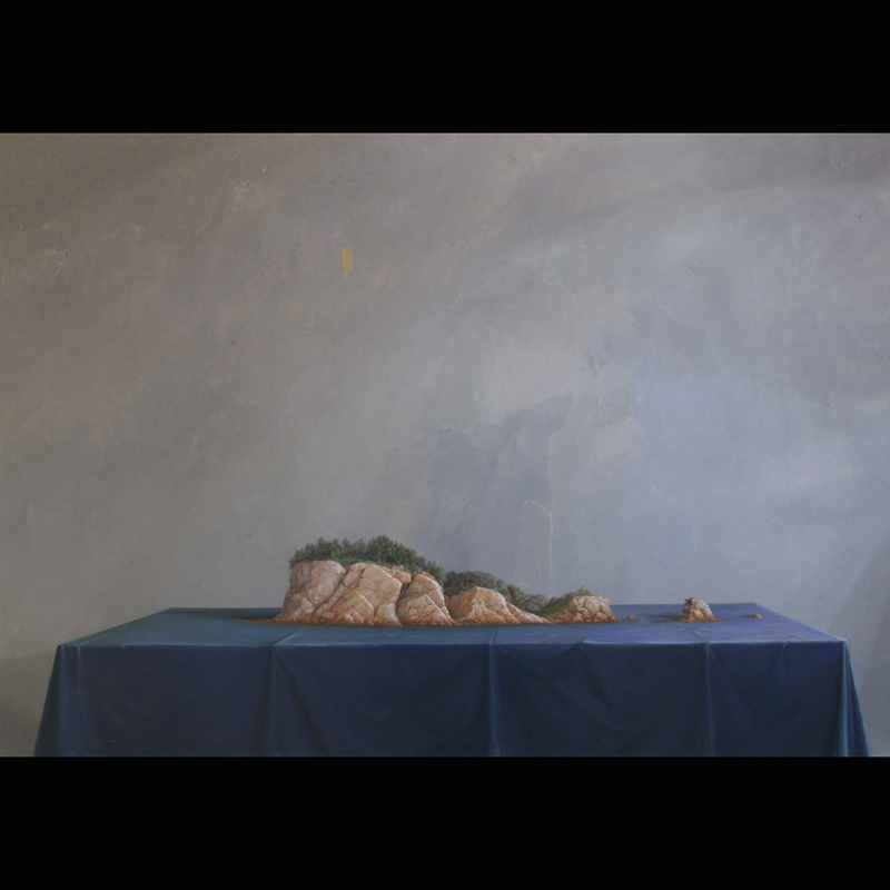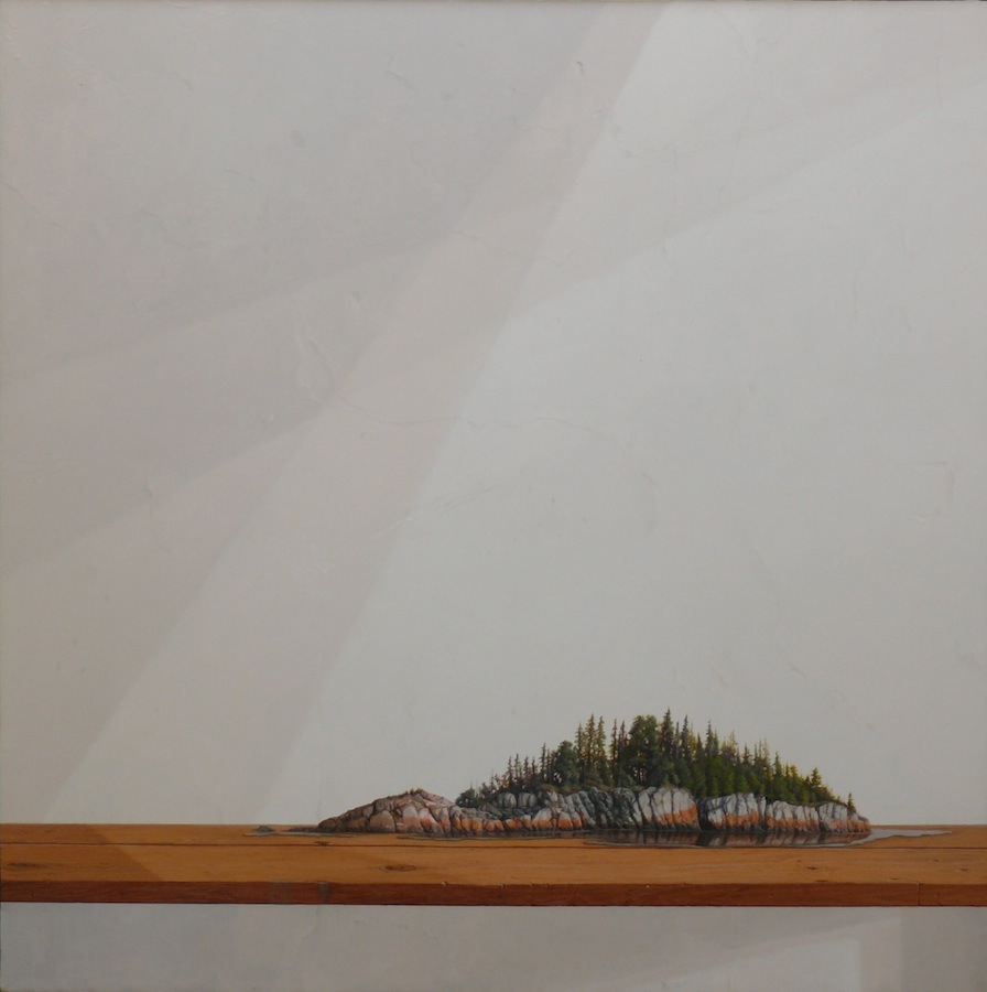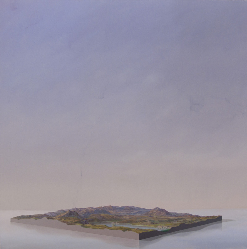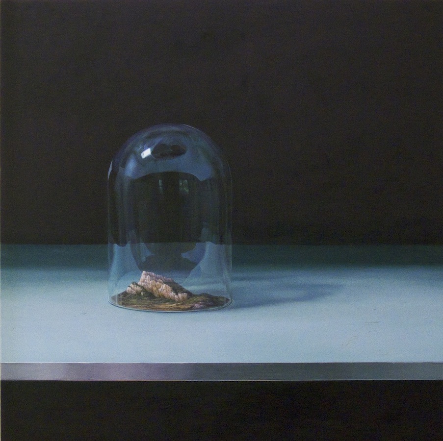 This group combines traditional still life painting and landscape. The landscape images are sometimes borrowed directly from 19th Century paintings by artists such as Frederic Church and Albert Bierstadt. These are incorporated into a small domestic space. The starting point was the thought that while we still place great value on the original paintings, they represent a view of the world that is anachronistic. For the Hudson River School generation the wilderness was certainly a place to visit, but the work of human civilization was always under threat from chaotic natural forces that would undo all of the hard work of building a habitable environment. Our conception of largely undisturbed tracts of land is that they represent a fragile order that is under threat from excessive human encroachment. We have become the chaotic force, and those endless landscapes appear very finite to us. Other themes include the commodification of landscape and our ability to ignore context when looking at something.