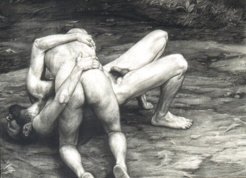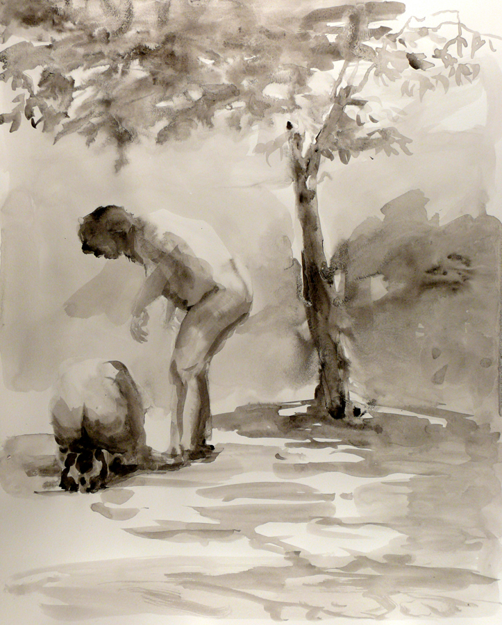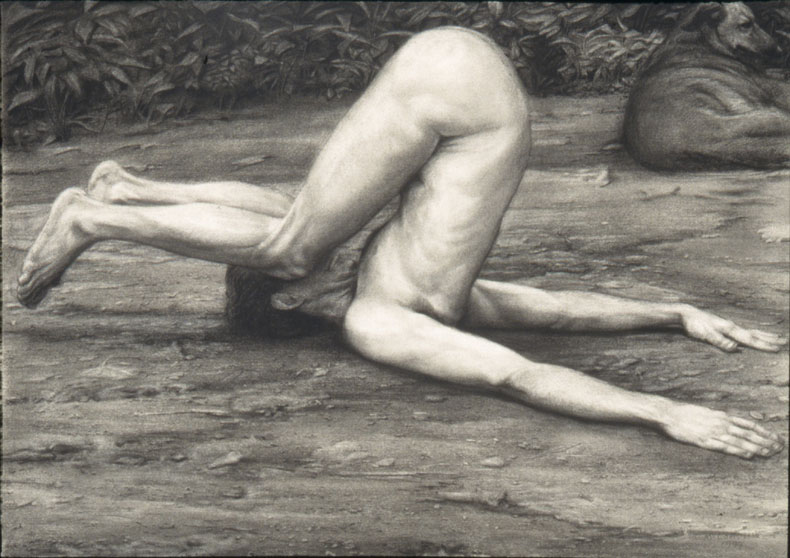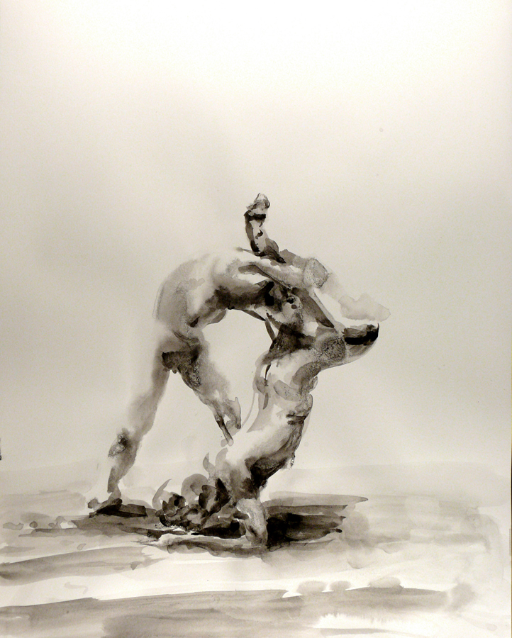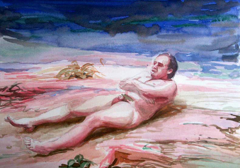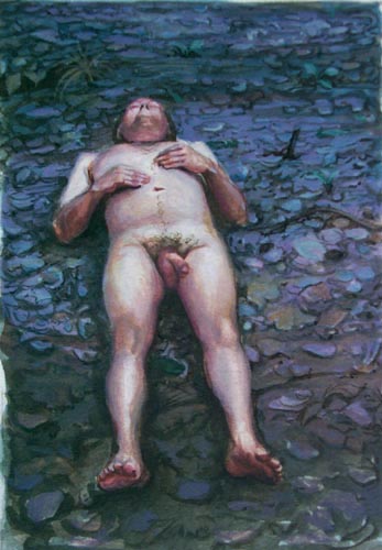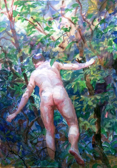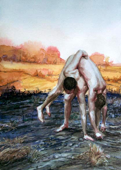 Here is a small sample of the kinds of work that I have done on paper. Figures 1 and 2 are conte crayon, each are about four feet across. The largest of this series is more than six feet across. Thematically they are related to the figure in landscape paintings. The ink drawings are about 11" x 14".The watercolors are small, most of them are smaller than twelve inches in the largest dimension. The small gouache painting is about 2" x 3", and was inspired by Indian miniatures. The pencil drawings are about the same size as the watercolors.