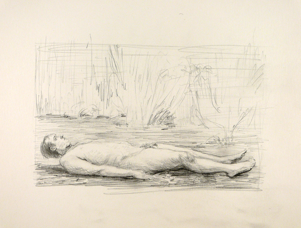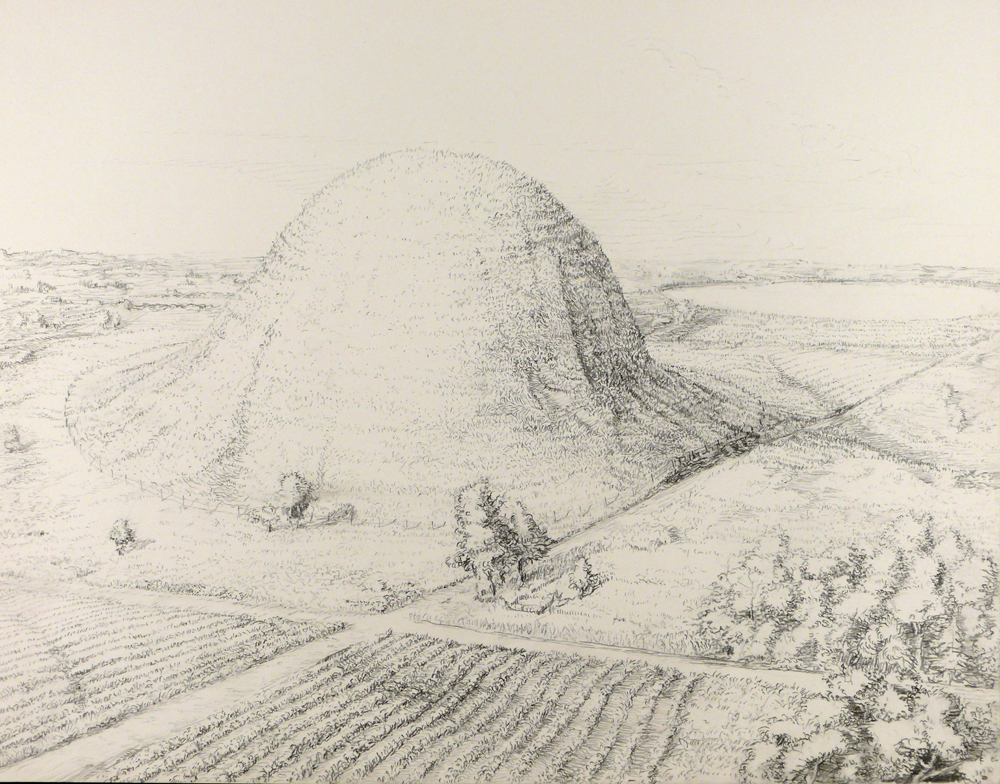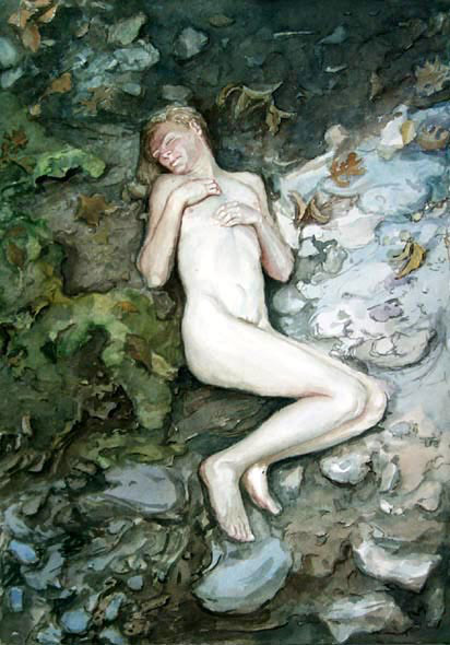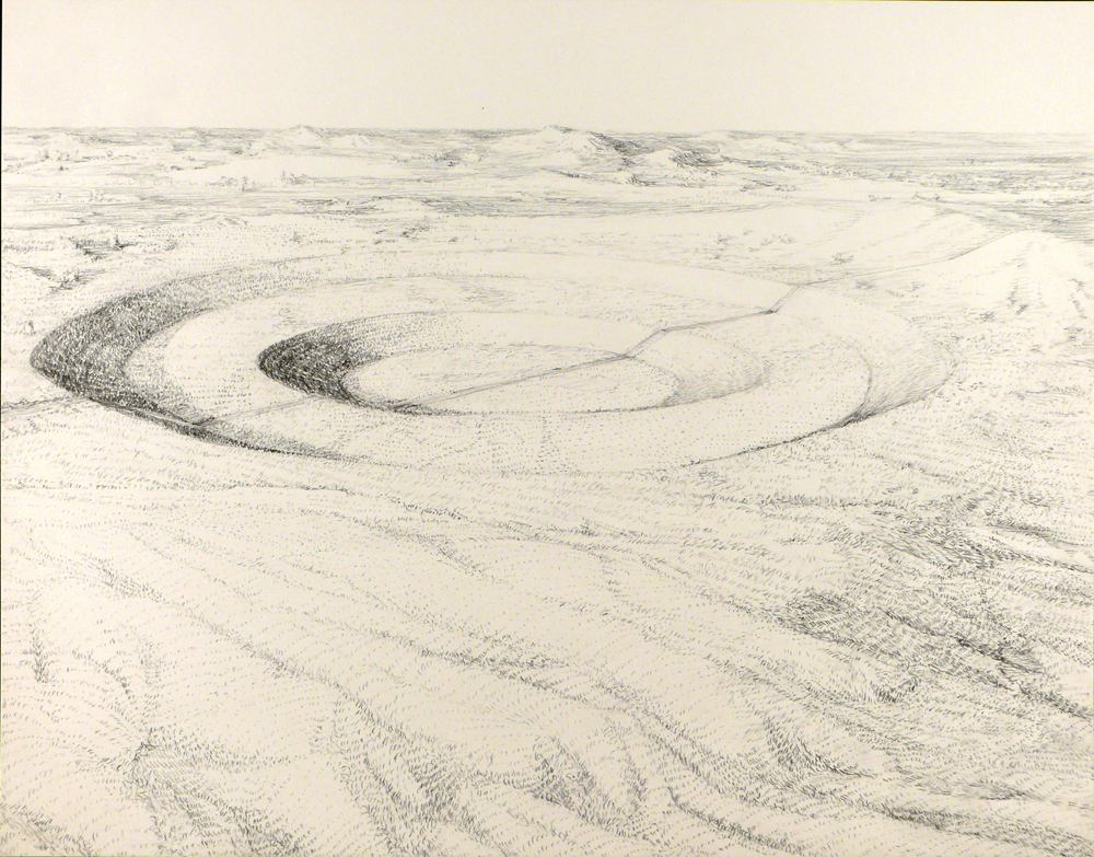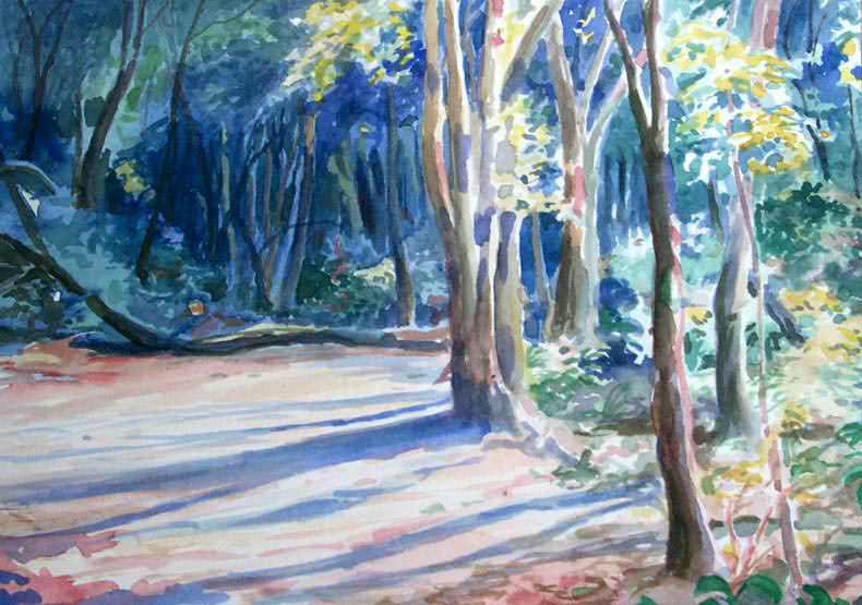 Here is a small sample of the kinds of work that I have done on paper. Figures 1 and 2 are conte crayon, each are about four feet across. The largest of this series is more than six feet across. Thematically they are related to the figure in landscape paintings. The ink drawings are about 11" x 14".The watercolors are small, most of them are smaller than twelve inches in the largest dimension. The small gouache painting is about 2" x 3", and was inspired by Indian miniatures. The pencil drawings are about the same size as the watercolors.